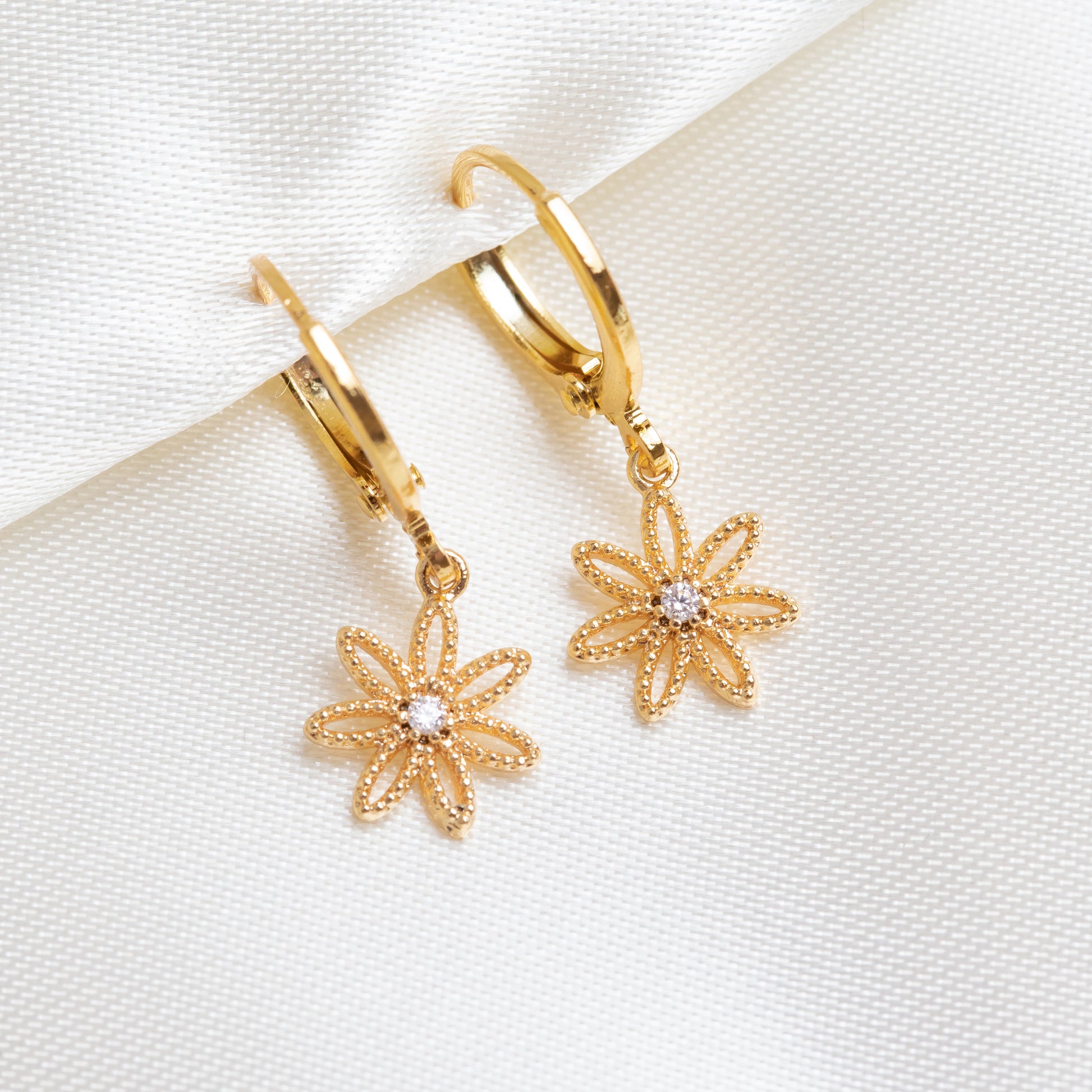 Argolla cerrada, charm de flores y circonia. Úsalas como aro principal o en una segunda perforación. Enchapadas en oro, libres de níquel, hipoalergénicas.