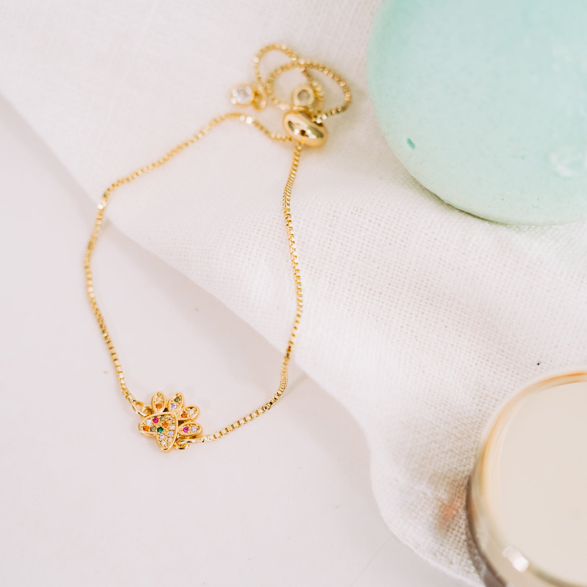Pulsera con patita de perro central con circonias de muchos colores. Ajustable, enchapada en oro, libre de níquel, hipoalergénica.